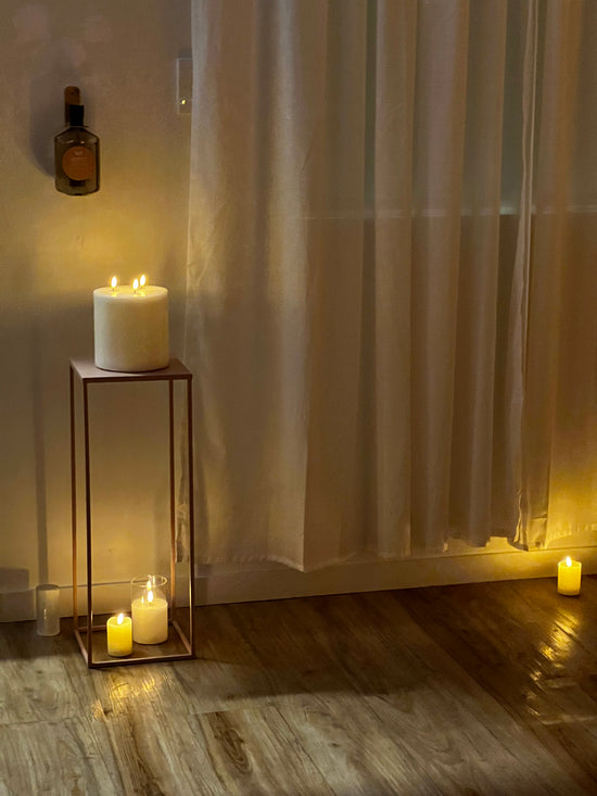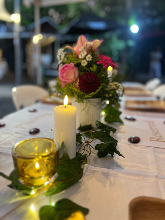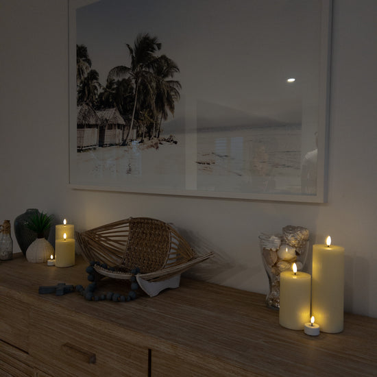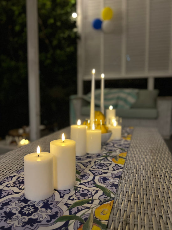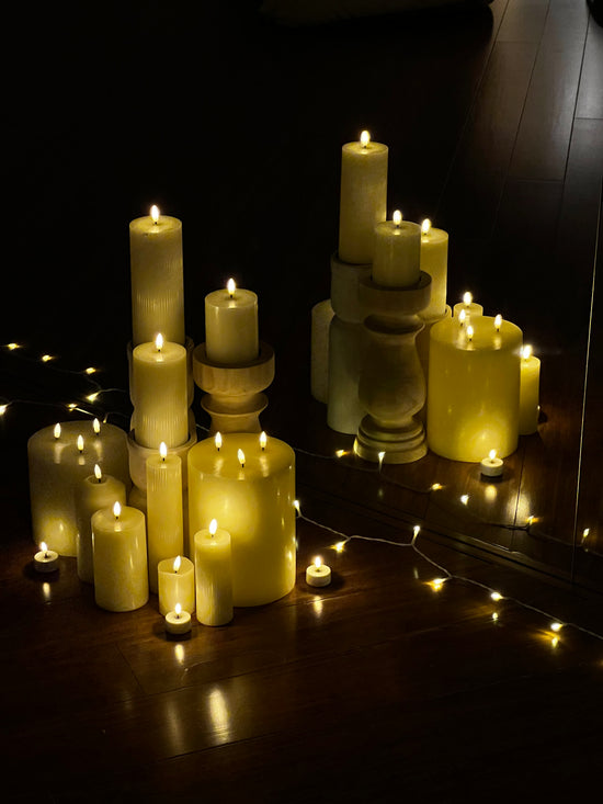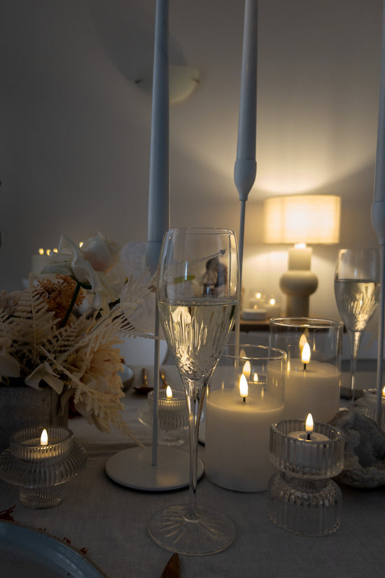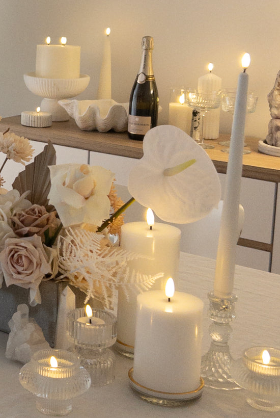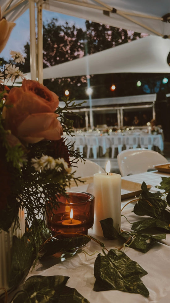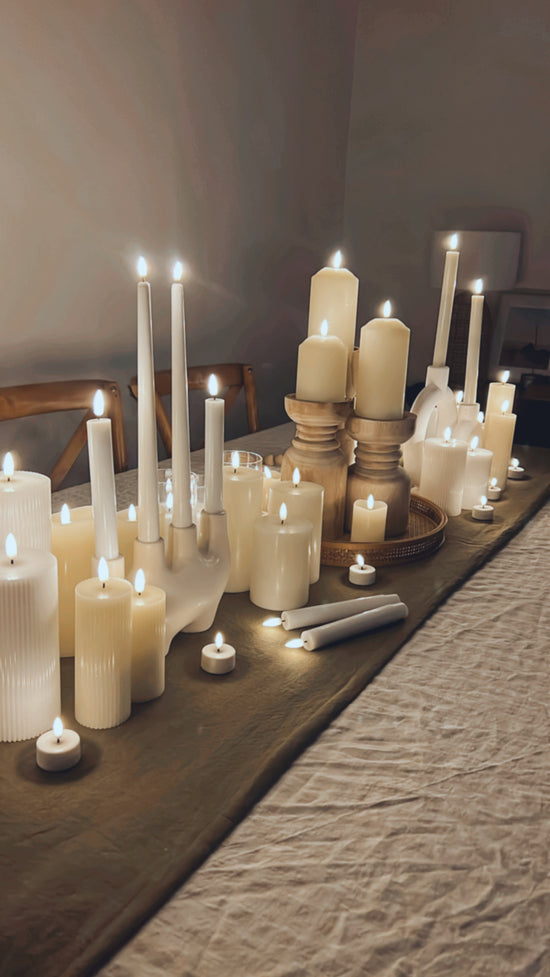 The ability to select varying heights, and styles in either our white or ivory real wax candles allows event planners to create a cohesive design that aligns with the theme of the occasion. Furthermore, most of our flameless candles for hire come equipped with a timer and brightness remote control, providing added convenience for event coordinators. (Please note: select sets have an auto 8r timer function only).